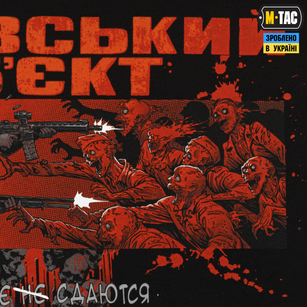 Основою для принта стала головна сюжетна лінія горору “Каховський об’єкт”: битва українських військових з совєцькими демонами минулого. Також, на ній відтворено діалог з фільму – істину, яку українські військові знають напевне: русскиє сдаются, коли п*зди отримують!