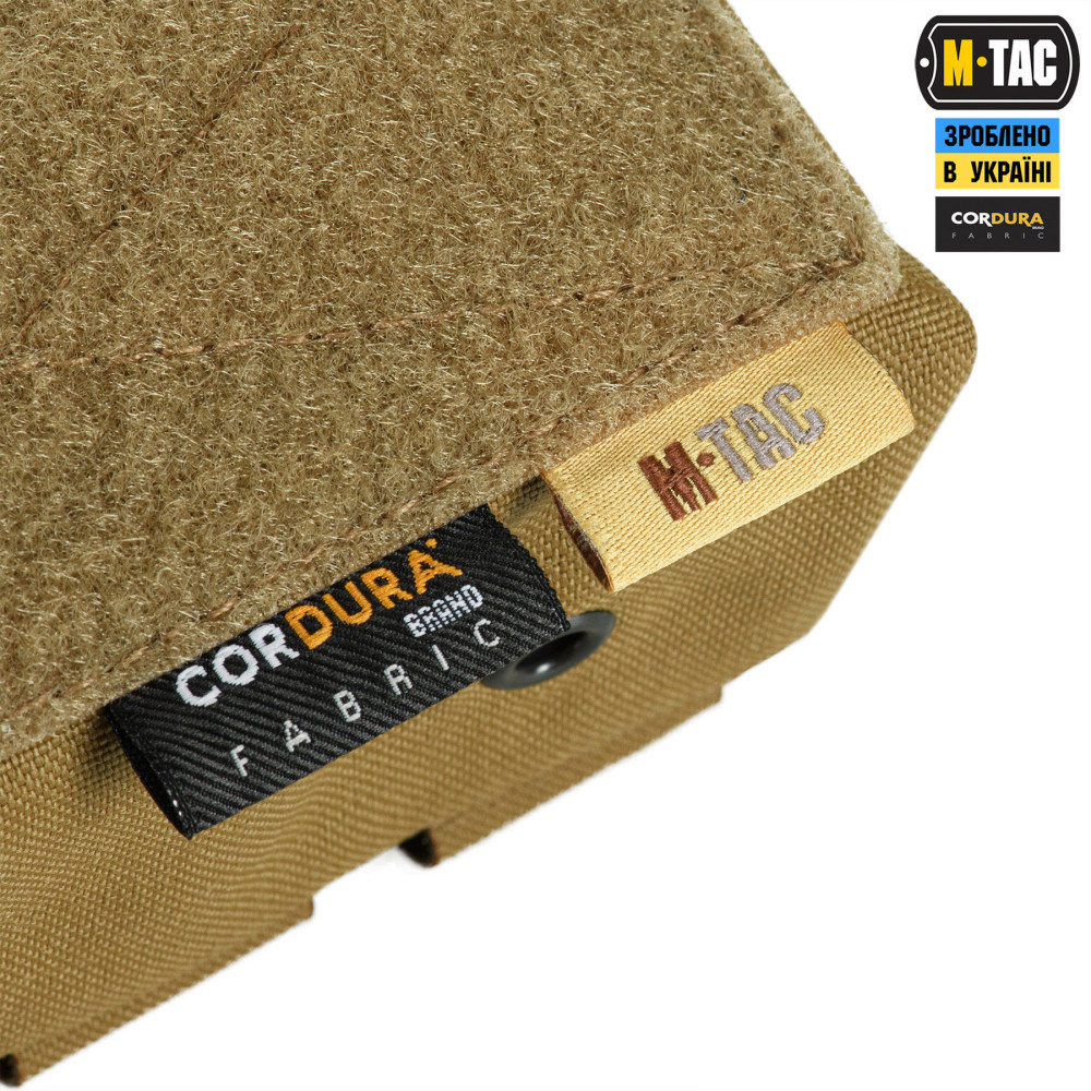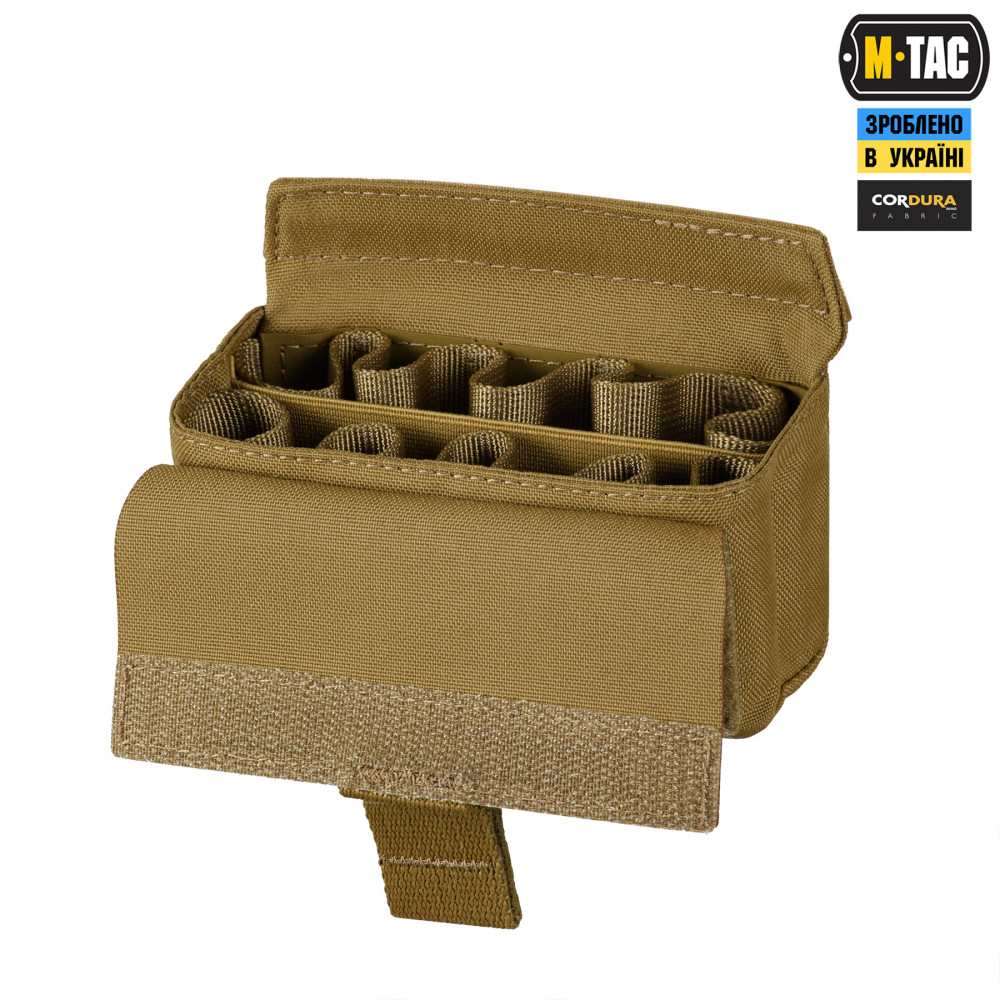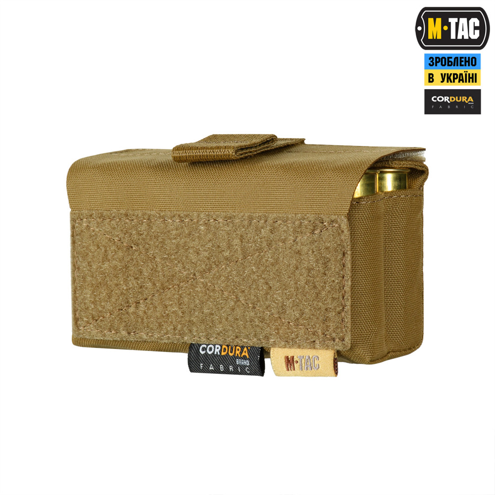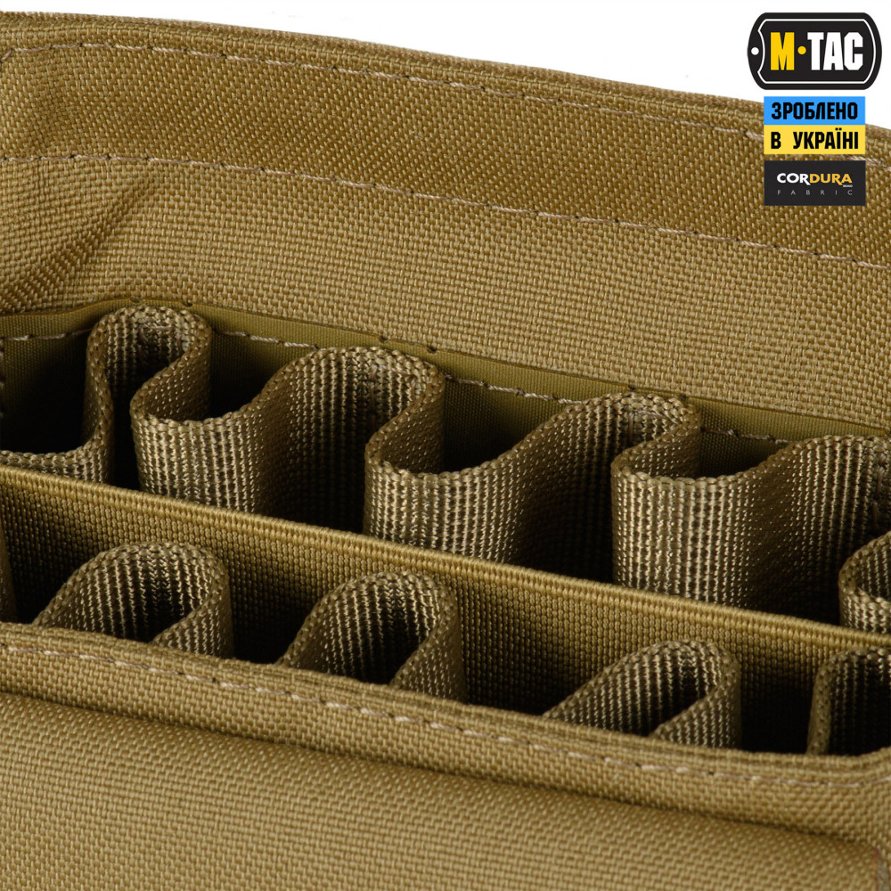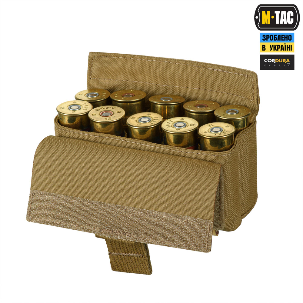 M-Tac підсумок під 12 калібр на 10 набоїв Elite кріпиться до спорядження за допомогою подовженої задньої частини, яка вплітається у MOLLE систему. На передній частині підсумка розташована велкро-панель для кріплення ідентифікаторів та патчів, а знизу – люверси, які запобігають накопиченню пилу/бруду всередині. Для зручності відкривання, хлястик зі стропи додатково посилений пластиком.