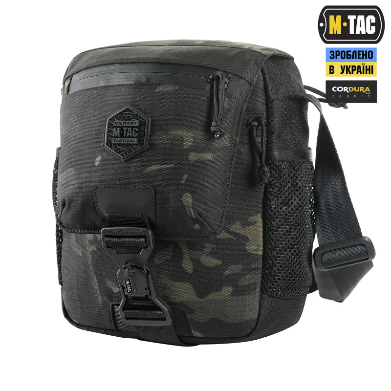 Виготовлена з Cordura Hex і Cordura 500D Multicam Black – надміцних матеріалів, стійких до стирання і механічних навантажень. Блискавки та пряжки від YKK і Woojin – світових лідерів із виробництва фурнітури. Сумка закривається магнітною застібкою Fidlock, яка розроблена в Німеччині та гарантує швидкий доступ до вмісту. Плечовий ремінь з мякої нейлонової стропи регулюється по довжині.