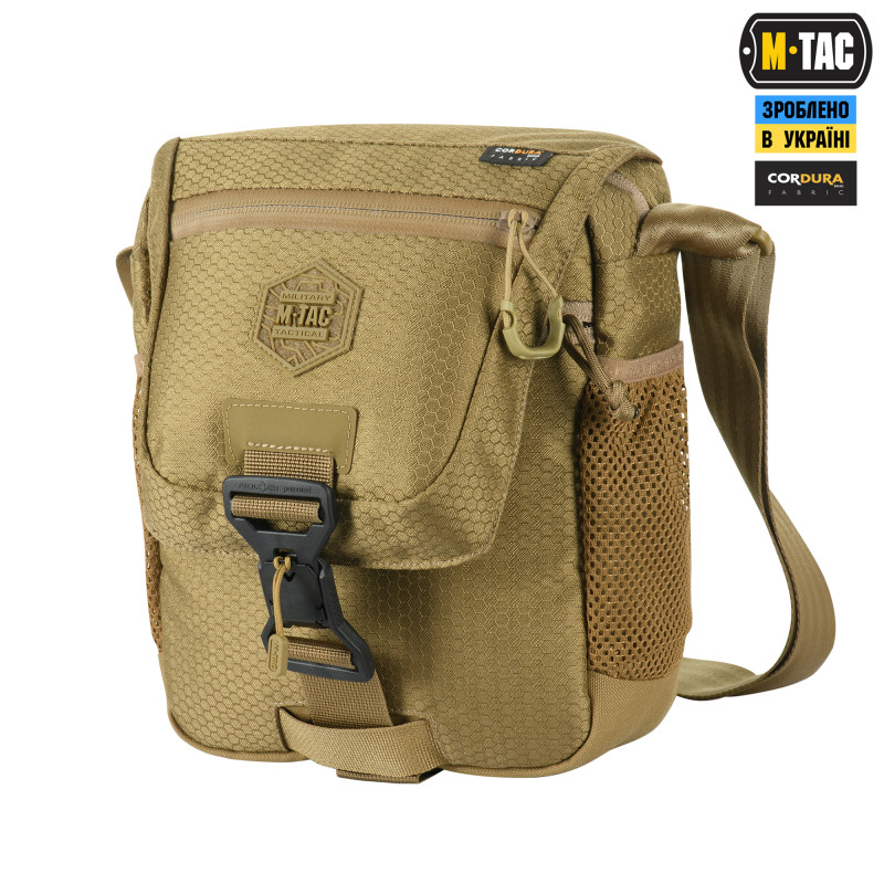 Виготовлена з Cordura Hex і Cordura 1000D – надміцних матеріалів, стійких до стирання і механічних навантажень. Блискавки та пряжки від YKK і Woojin – світових лідерів із виробництва фурнітури. Сумка закривається магнітною застібкою Fidlock, яка розроблена в Німеччині та гарантує швидкий доступ до вмісту. Плечовий ремінь з мякої нейлонової стропи регулюється по довжині.