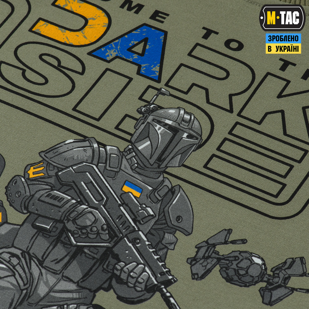 Унікальний принт кофти як ніколи актуальний в умовах сучасних реалій. На принті зображені українські космодесантники зі зброєю в руках, які стоять на трупах радянських ворогів. Написи «Come to the Dark Side» ("Переходь на Темну сторону") і «Dominate or die» ("Домінуй або помри") підкреслюють індивідуальність власника футболки. На рукавах з одного боку розміщений красивий логотип "M-Tac UA", а з іншого – силует українського герба, в якому можна розгледіти винищувач "Темної сторони".