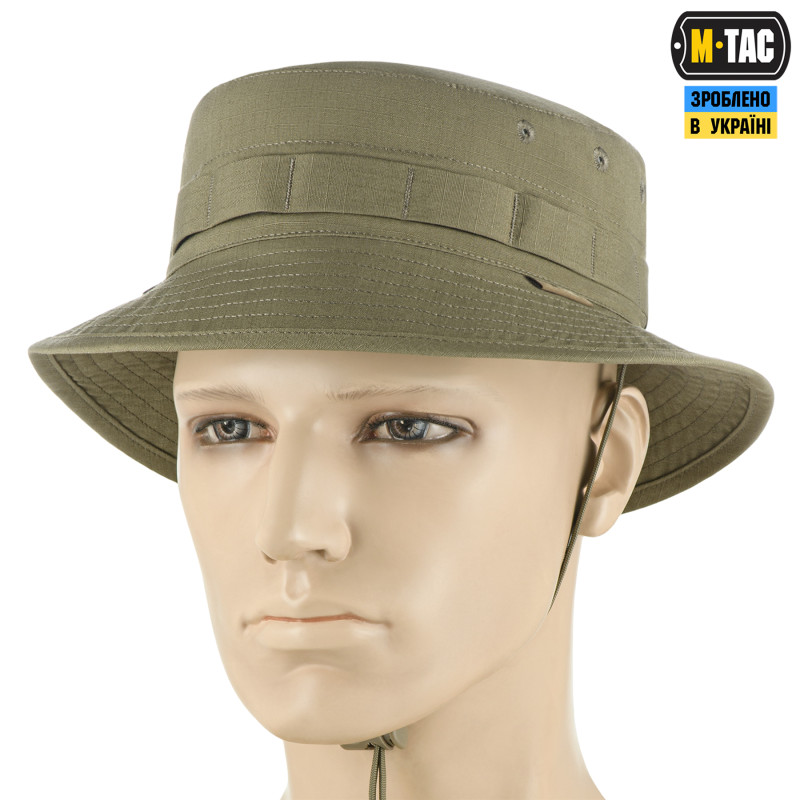 Армійська панама від бренду M-Tac зроблена за зразком легендарної американської моделі Boonie. Має крій з напівжорсткими полями. Тулія з нашитою по периметру стрічкою, яка розрахована на кріплення додаткових засобів маскування. Забезпечена спеціальним шнуром, що не дозволить панамі злетіти з голови під час сильних поривів вітру. Також вона має три вбудованих люверси, які забезпечують відмінну вентиляцію. Панама пошита з міцної та якісної тканини ріп-стоп (бавовна, поліестер, спандекс). З вивороту всі шви приховані. Такий спосіб обробки швів робить панаму більш комфортною при тривалому носінні, а також підвищує її стійкість до зношування.