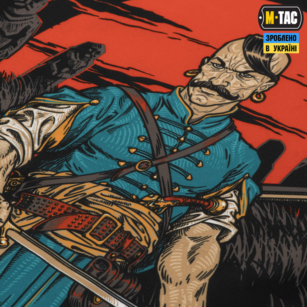 На принті зображений козак, який чистить свою шаблю від ворожої крові травою. Його образ є нагадуванням, що тільки ми є господарями української землі, а хто прийде до нас зі зброєю в руках – від неї і загине. На банері також зображений сокіл, що в словянській міфології виступав символом посередництва між світом живих та мертвих. Тож душі всіх знищених окупантів, він буде доставляти в самісіньке пекло. Тло забарвлює схід українського сонця та славнозвісні “половецькі баби” - уособлення багатовікової української історії.