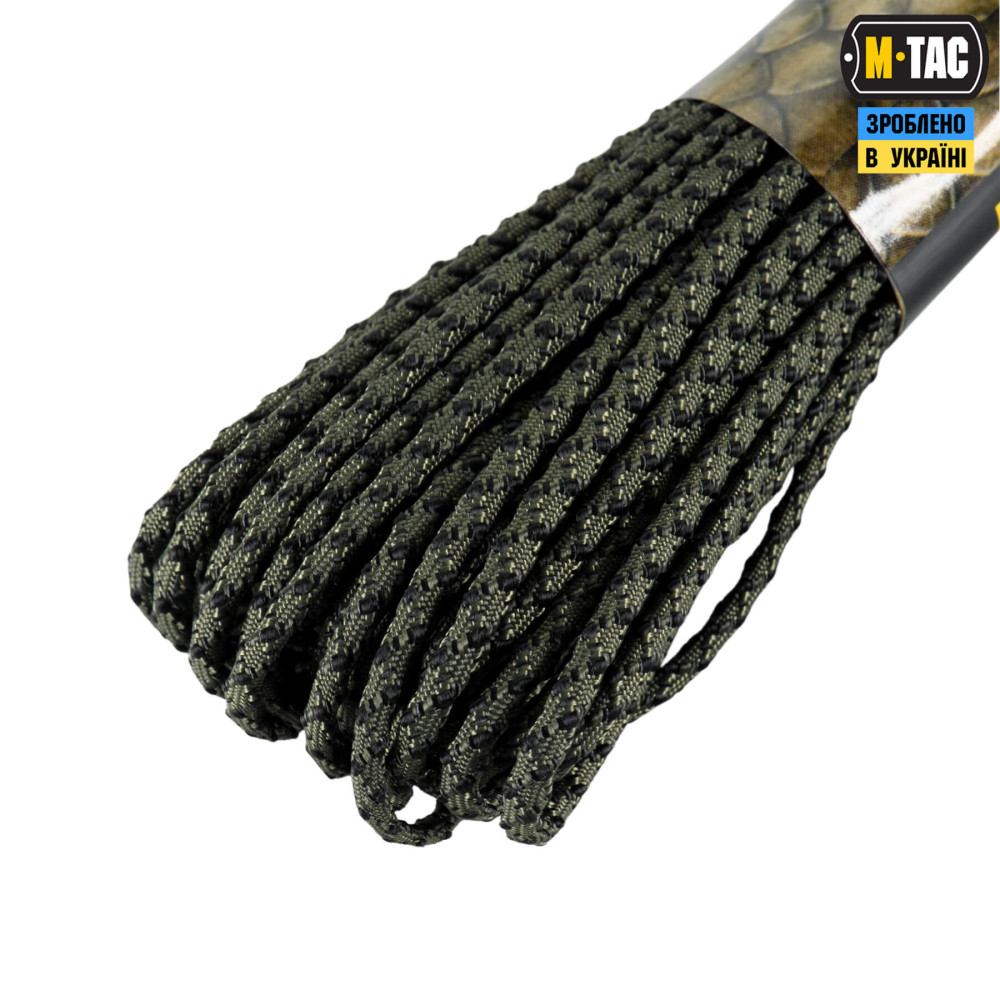 Паракорд виготовлений зі 100% нейлону – легкого та водночас зносостійкого матеріалу. Має рифлену плетену структуру, завдяки чому гарантуватиме відмінне зчеплення з будь-якою поверхнею. Складається із зовнішнього обплетення та осердя, які в комбінації забезпечують високу міцність на розрив та невелику вагу.
