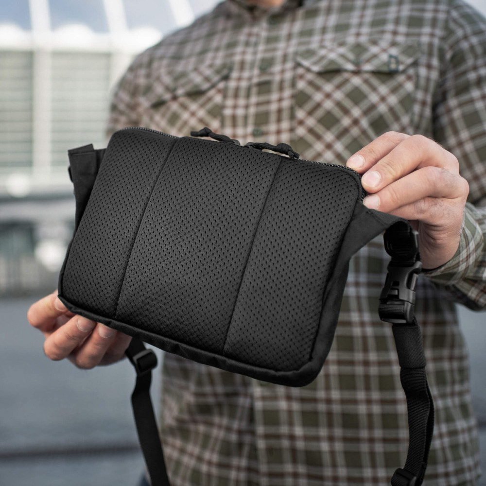 M-Tac сумка Admin Bag оснащена регульованою лямкою з фастексами швидкого скидання та D-кільцями, для підвісу додаткового устаткування. ЇЇ задня частина – має невелику приховану кишеню, яка відмінно підійде для перенесення телефону, або ж подібних за розміром речей.