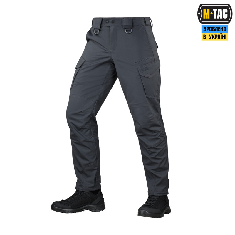 Тактичні штани Aggressor Gen.II Flex ви можете використовувати як для тренувань, стрільбища, роботи, так і для ділової подорожі або прогулянки. Вітчизняний бренд M-Tac намагається вносити інноваційні технології на ринок. Пошиті штани з легкої, однотонної тканини ріп-стоп, із водо- і брудозахисним просоченням Teflon. Тканина з вмістом поліестеру і бавовни приємна до тіла, добре тримає колір і відрізняється високою міцністю. Основним завданням дизайнерів брюк було зберегти комфорт рухів, і з цим вони впоралися на всі сто відсотків – штани створюють відчуття легкості, не сковують рухи і виглядають стильно і солідно. Зручні широкі кишені з посиленими вставками. Штани розраховані на носіння з ременем шириною до 5.5 сантиметрів. Спереду на кріпленнях для ременя нашиті пряжки для кріплення чого завгодно (за допомогою карабінів). Якісна фурнітура від компанії YKK. Добре підібрані за розміром штани настільки зручно сидять і носяться, що складається враження, ніби вдягнений в спортивні штани.